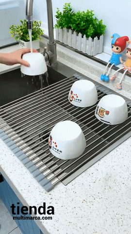magina una rejilla que se ajusta a cualquier tamaño de fregadero, lavando frutas y verduras de forma eficiente y escurriendo tus platos con comodidad. Además, su lavavajillas integrado hace que la limpieza sea rápida y sencilla.